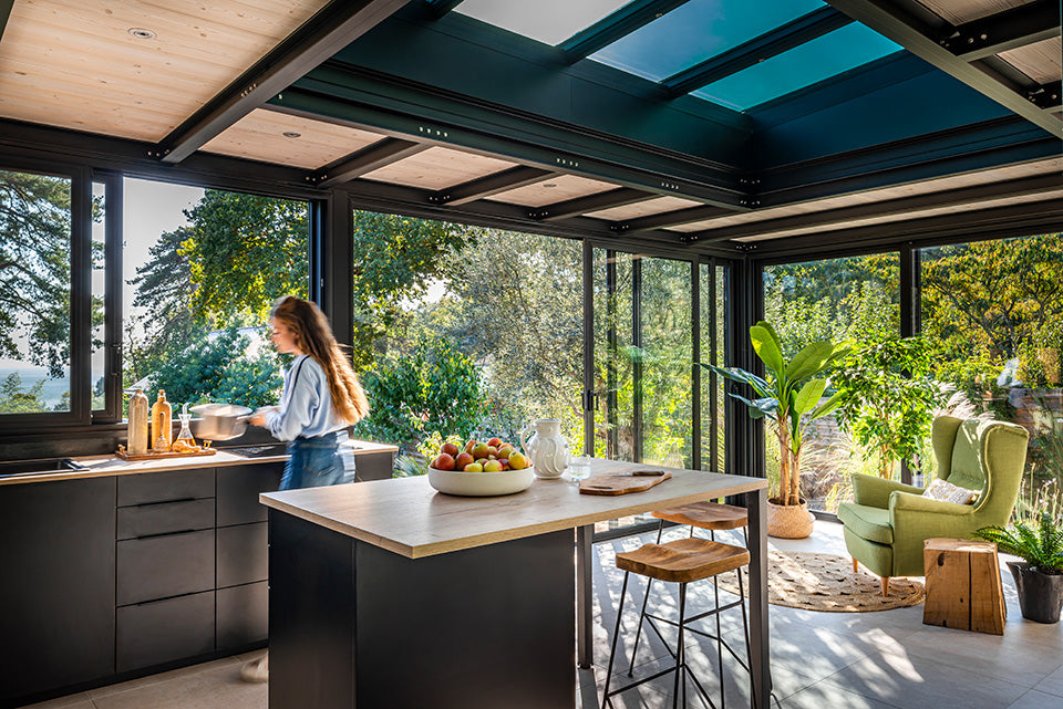 Grâce à l'isolation haute performance de nos solutions Extension par Concept Alu, profitez d'une pièce de vie cosy toute l'année, idéale pour lire, partager et respirer face à la nature, de Chambéry à Grenoble.