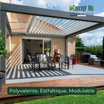 Concept Alu propose une large gamme d’options pour votre Pergola à Toiture Mixte : personnalisation sur mesure, accessoires de confort, protection solaire et design haut de gamme pour sublimer votre extérieur.