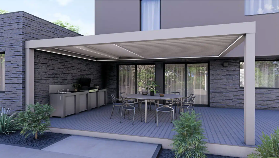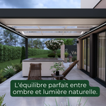 Cette configuration permet de segmenter votre Pergola en zones distinctes : un espace parfaitement abrité et opaque pour une cuisine d'été, par exemple, couplé à une zone bioclimatique respirante pour un salon de jardin relaxant.