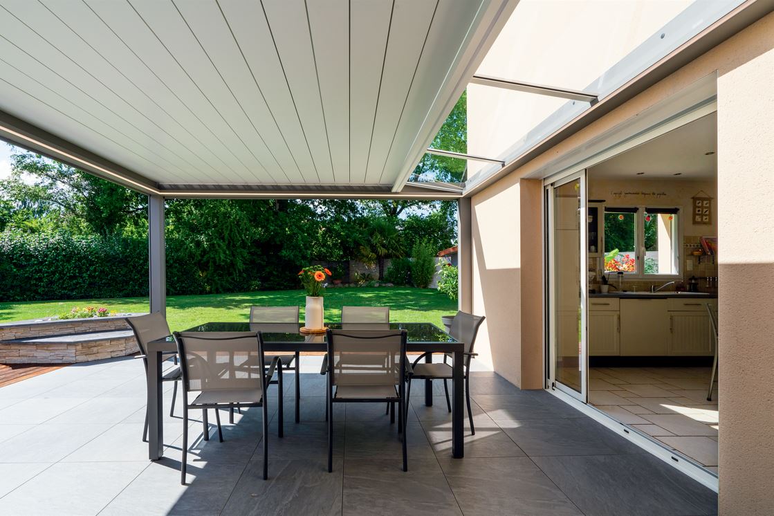 Les panneaux pleins offrent une isolation thermique performante et une protection solaire totale, idéales pour créer un coin repas ombragé et frais. En y insérant des sections vitrées, vous créez des puits de jour stratégiques qui baignent votre intérieur de lumière naturelle.