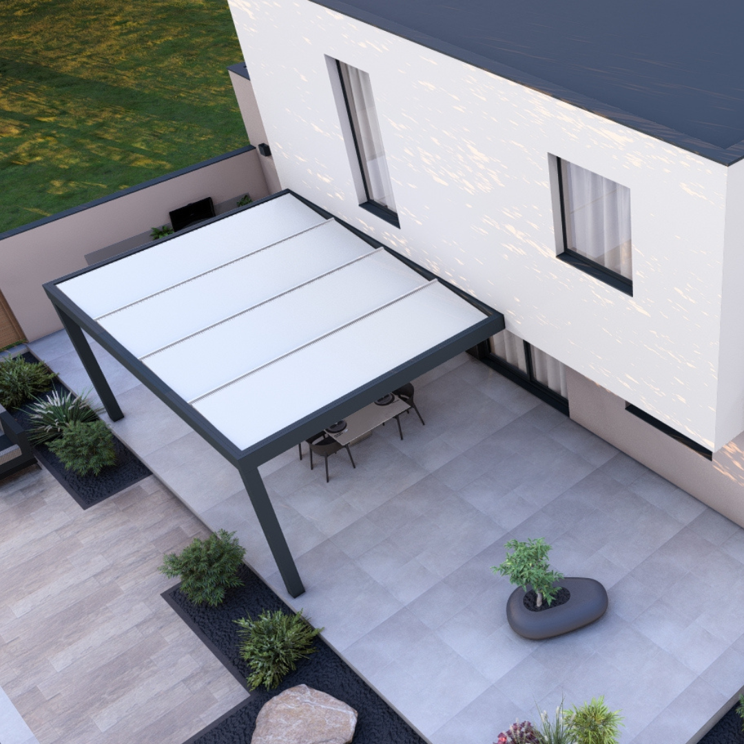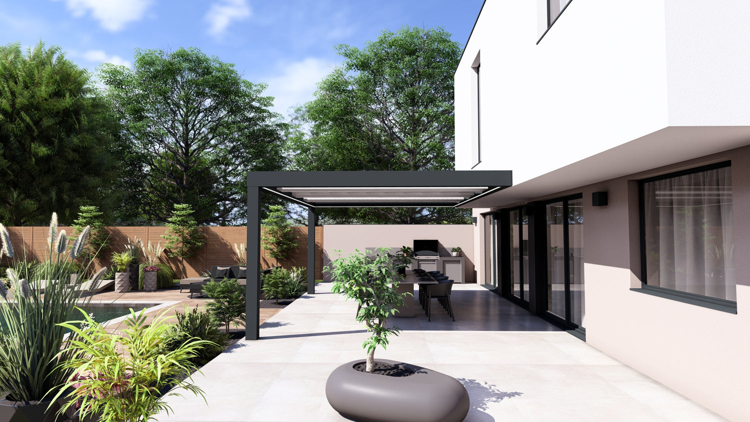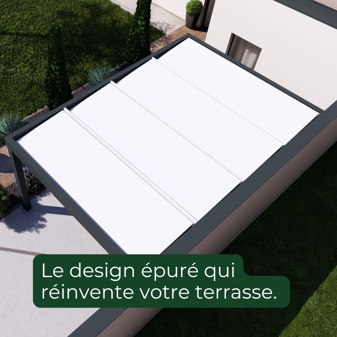 Véritable signature architecturale, la Pergola à toiture plate transforme votre terrasse en une pièce de vie haut de gamme.