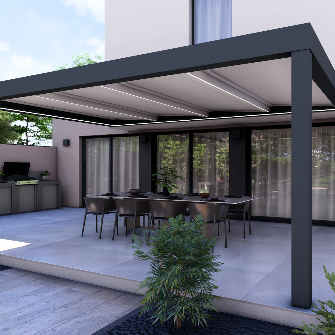 Sa structure offre une flexibilité totale : vous pouvez sculpter l'ambiance de vos soirées grâce à des rubans LED élégamment intégrés en pourtour ou directement dans la toiture. Pour une protection sur mesure, l'espace se ferme et se module selon vos besoins : optez pour la discrétion des Stores Zips Screen, la transparence des coulissants en verre ou l'élégance naturelle des claustras.